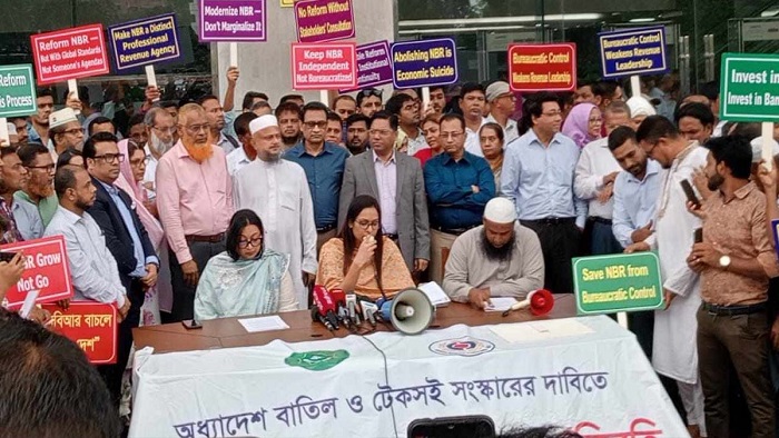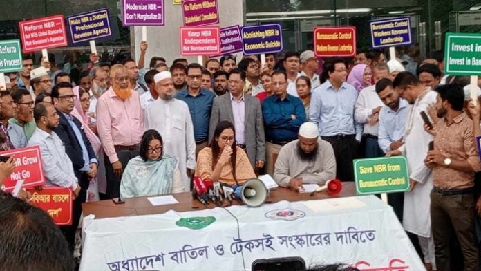 সংবাদ সম্মেলন বলা হয়, দেশের অর্থনৈতিক কর্মকাণ্ড ও সাপ্লাই চেইন ব্যবস্থাপনা স্বাভাবিক রাখা এবং অর্থবছরের শেষ প্রান্তে রাজস্ব আহরণ কার্যক্রম সচল রাখার স্বার্থে আমাদের মূল চারটি দাবি পূরণের বিষয়ে সুস্পষ্ট ঘোষণা প্রদান করার জন্য আমরা সরকারকে অনুরোধ জানাচ্ছি। একইসঙ্গে আমাদের কর্মসূচির ফলে করদাতা ও সেবাপ্রার্থীদের সাময়িক অসুবিধার জন্য এনবিআর সংস্কার ঐক্য পরিষদ আন্তরিকভাবে দুঃখ প্রকাশ করছে। এনবিআর সংস্কার ঐক্য পরিষদ মনে করে তাদের এই সাময়িক ত্যাগ দেশ ও জনগণের বৃহত্তর স্বার্থে ও রাজস্ব ব্যবস্থার টেকসই সংস্কারে সক্রিয় ভূমিকা রাখবে। রাজস্ব ব্যবস্থার প্রয়োজনীয় ও সময়োপযোগী সংস্কারের ক্ষেত্রে আমাদের এই যৌক্তিক দাবিগুলো সরকার কী কারণে, কার প্রভাবে বা কোন অজুহাতে এখনো বাস্তবায়ন করছে না, তা আমাদের কাছে স্পষ্ট নয়। যেহেতু আমাদের চারটি সুনির্দিষ্ট দাবি পূরণের বিষয়ে সরকারের পক্ষ থেকে অদ্যাবধি সুস্পষ্ট ঘোষণা প্রদান করা হয়নি, সেহেতু আমাদের পূর্বঘোষিত কর্মসূচি অব্যাহত থাকবে।