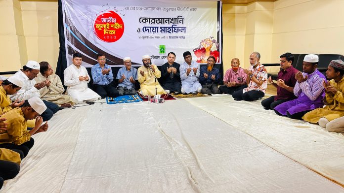 জাতীয় জুলাই শহীদ দিবস পালন উপলক্ষ্যে চট্টগ্রাম প্রেস ক্লাবে চব্বিশের জুলাই বিপ্লবে নিহত সকল শহীদদের স্মরণে কুরআনখানি ও দোয়া মাহফিল অনুষ্ঠিত হয়। মাহফিলে সভাপতিত্ব করেন প্রেস ক্লাব শৃঙ্খলা ও ব্যবস্থাপনা উপকমিটির আহবায়ক প্রবীণ সাংবাদিক মঈনদ্দীন কাদেরী শওকত। প্রেস ক্লাবের সিনিয়র সদস্য শাহনেওয়াজ রিটনের পরিচালনায়