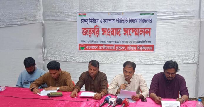 চট্টগ্রাম বিশ্ববিদ্যালয় কেন্দ্রীয় ছাত্র সংসদ (চাকসু) নির্বাচন এবং ক্যাম্পাসের সামগ্রিক পরিস্থিতি নিয়ে জরুরি সংবাদ সম্মেলন করেছে শাখা ছাত্রদল।