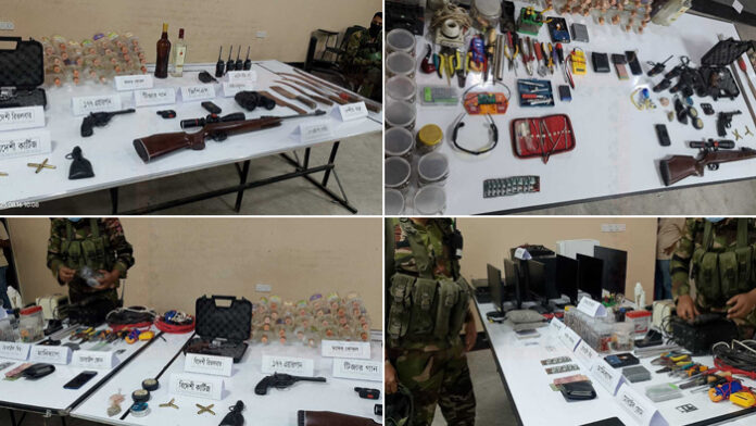 সেনাবাহিনী সূত্র জানায়, অভিযানে উদ্ধার করা হয়েছে দুটি বিদেশি এয়ারগান, একটি রিভলভার, বিভিন্ন কার্তুজ, তিন বক্স এয়ারগান শিশা, একটি ম্যাগনেট, ছয়টি দেশীয় অস্ত্র, একটি জিপিএস, চারটি ওয়াকিটকি, একটি ট্রাজারগান, ১০টি সিমকার্ড, একটি বাইনোকুলার, বিস্ফোরক তৈরির সরঞ্জাম, পাসপোর্ট, জাতীয় পরিচয়পত্র, ছয়টি মনিটর, তিনটি কম্পিউটার, তিনটি স্ক্যানার এবং ৩৫ বোতল মদ।